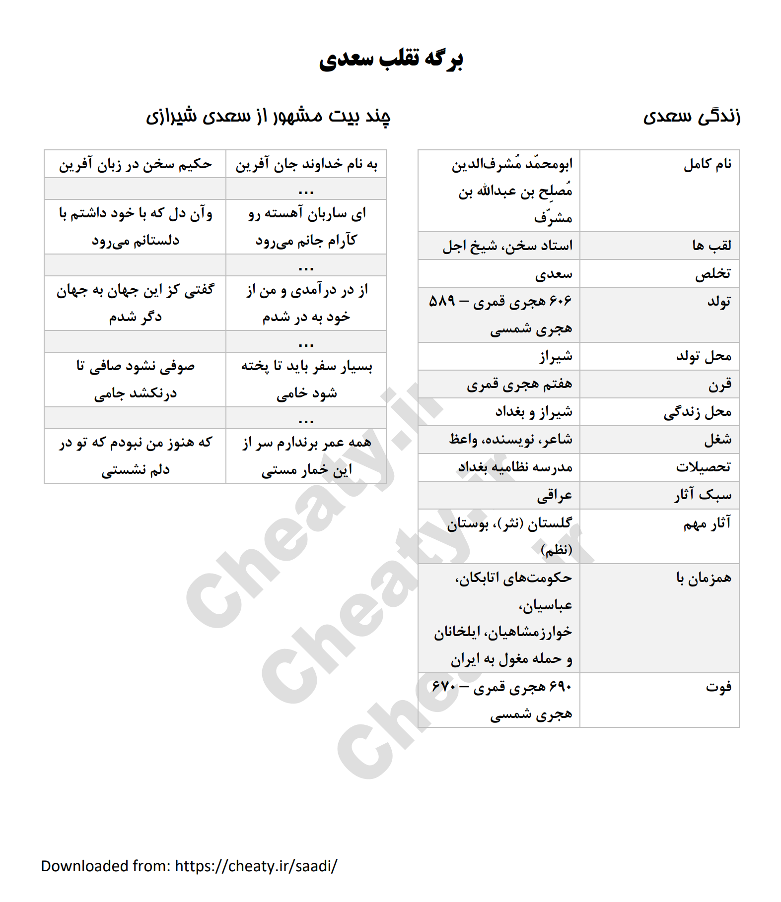 دانلود چیت شیت زندگی نامه و اشعار سعدی